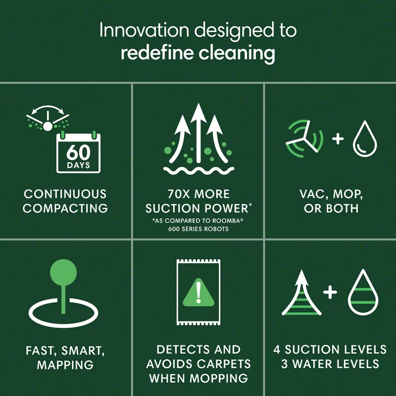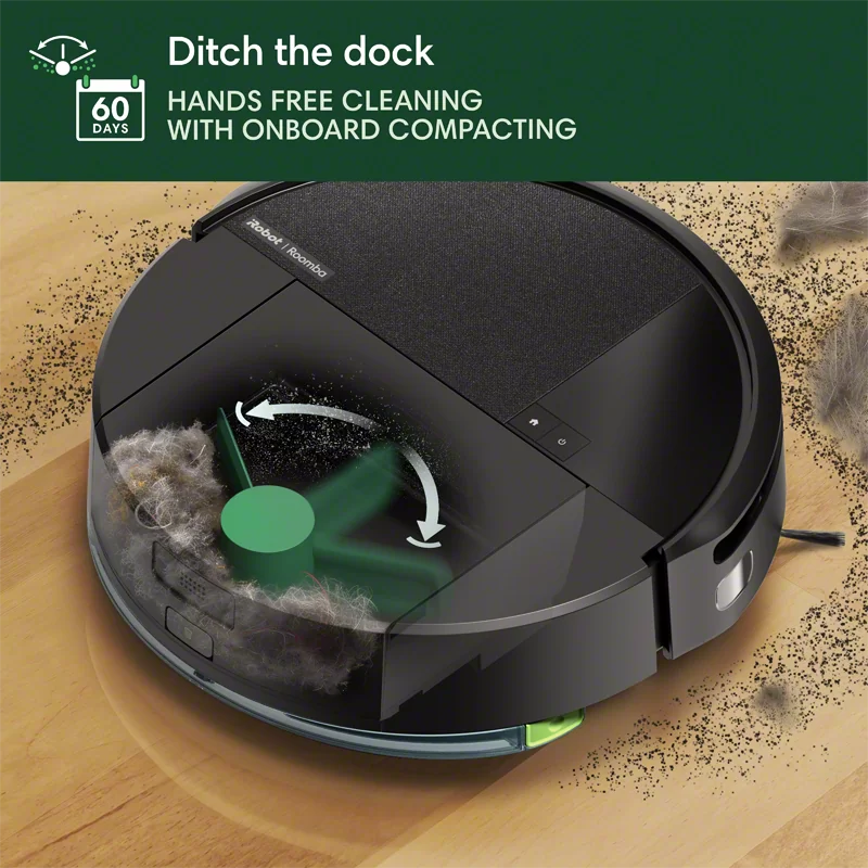 • DITCH DOCK THE. An industry first, only from Roomba, this robot continuously crushes debris right inside using a mechanical compacting process, so you don’t have to empty it for up to 60 days.